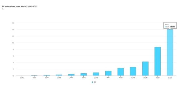 當(dāng)前全球電動(dòng)車市場(chǎng)發(fā)展迅猛。國(guó)際能源署的數(shù)據(jù)顯示,2022年全球新能源車銷量超過(guò)1000萬(wàn)輛,其中每銷售100輛新車中就有14輛是新能源車。與2019年的市場(chǎng)份額9%和2020年的市場(chǎng)份額5%相比,滲透率呈指數(shù)級(jí)增長(zhǎng)。