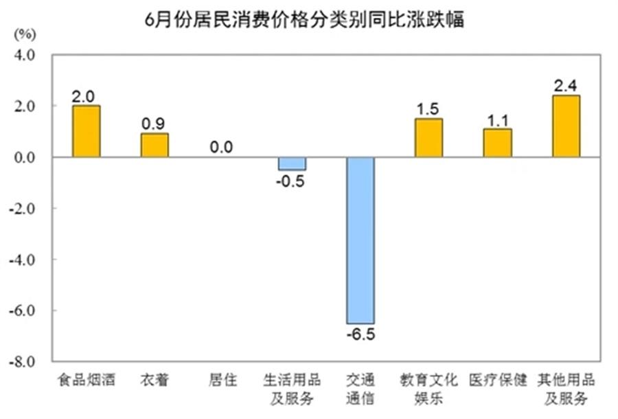 具體來看,6月份,全國居民消費(fèi)價(jià)格環(huán)比下降了0.2%。其中,城市消費(fèi)價(jià)格下降了0.2%,農(nóng)村消費(fèi)價(jià)格也下降了0.2%。食品價(jià)格下降了0.5%,非食品價(jià)格下降了0.1%。消費(fèi)品價(jià)格下降了0.3%,服務(wù)價(jià)格上漲了0.1%。