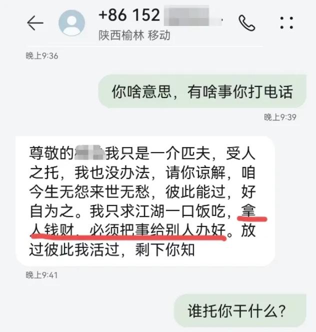 楊先生繼續收到威脅短信,他再次向派出所報警,并與對方通話,但對方依然沒有接聽。楊先生將已報警的情況告知對方,但對方表示只要楊先生放過他,他也會交差。在此期間,楊先生的愛人也一直收到來自該號碼的騷擾。