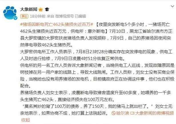 養豬場負責人劉女士表示,停電導致豬舍溫度升至60多攝氏度,導致她飼養的一千多頭生豬中有462頭死亡,直接經濟損失達到了約100萬元。