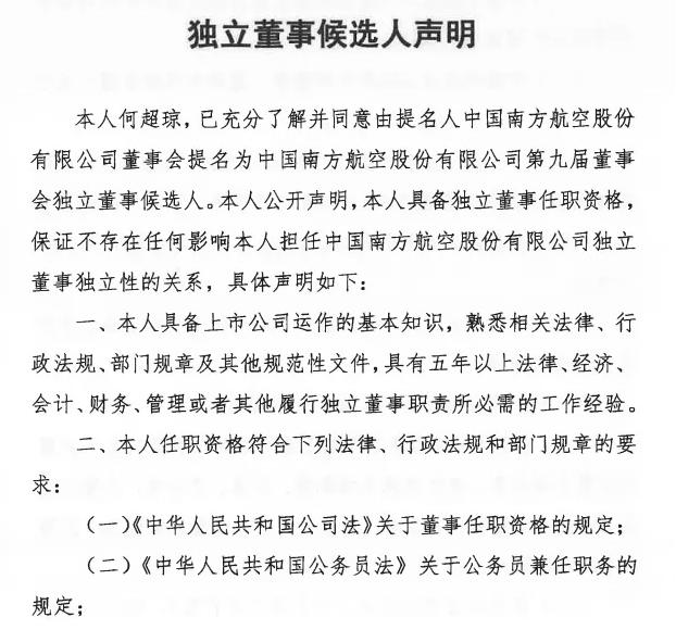 何超瓊在《獨立董事候選人聲明》中簽字表示:“本人公開聲明,本人具備獨立董事任職資格,保證不存在任何影響本人擔任南方航空獨立董事獨立性的關系。”