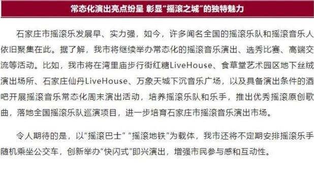 除了大型音樂節,石家莊還將持續舉辦常態化的搖滾音樂演出、選秀比賽和高端交流活動。各個音樂場所將開展常態化周末搖滾音樂演出,培養本土搖滾樂隊和樂手,推出優秀的原創歌曲,并通過全國巡演項目將他們的音樂推向更廣闊的舞臺。此外,以“搖滾巴士”和“搖滾地鐵”為載體的“快閃式”即興演出活動也將讓市民參與其中,增強互動性和參與感。