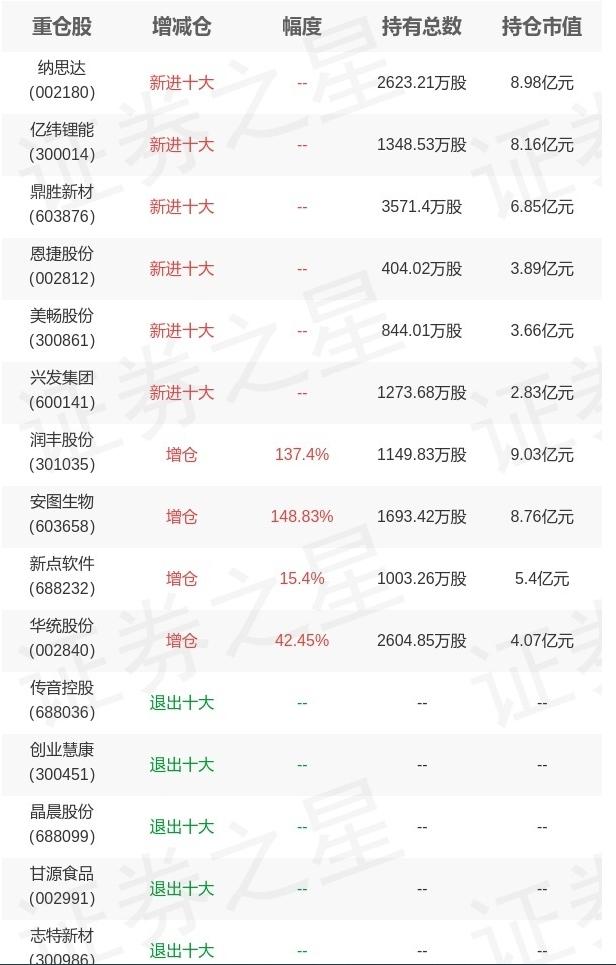 新增重倉(cāng)股:納思達(dá)、億維鋰能、鼎勝新材、恩捷股份、美暢股份、興發(fā)集團(tuán)。