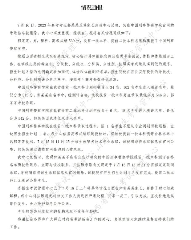 山西省招生考試管理中心網(wǎng)站在7月19日發(fā)布了一份情況通報,針對考生郭某某及其家長反映的問題做出了回應。根據(jù)通報內(nèi)容,郭某某是一名男生,理科,高考成績?yōu)?39分,他填報了中國刑事警察學院的提前一批本科和提前二批本科志愿。