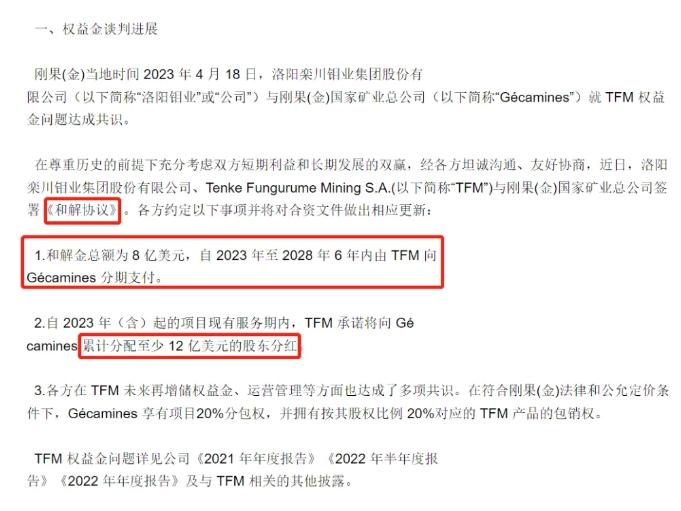 此前,在2022年度報告中,洛陽鉬業曾表示,公司與TFM管理團隊與剛果(金)各相關方進行了持續的會議溝通,主要討論TFM混合礦開發項目擬增加的銅金屬儲量以及與此相關的增儲權益金支付問題。這一溝通過程復雜而動態,截至報告日期,雙方尚未就討論的相關事項達成一致。