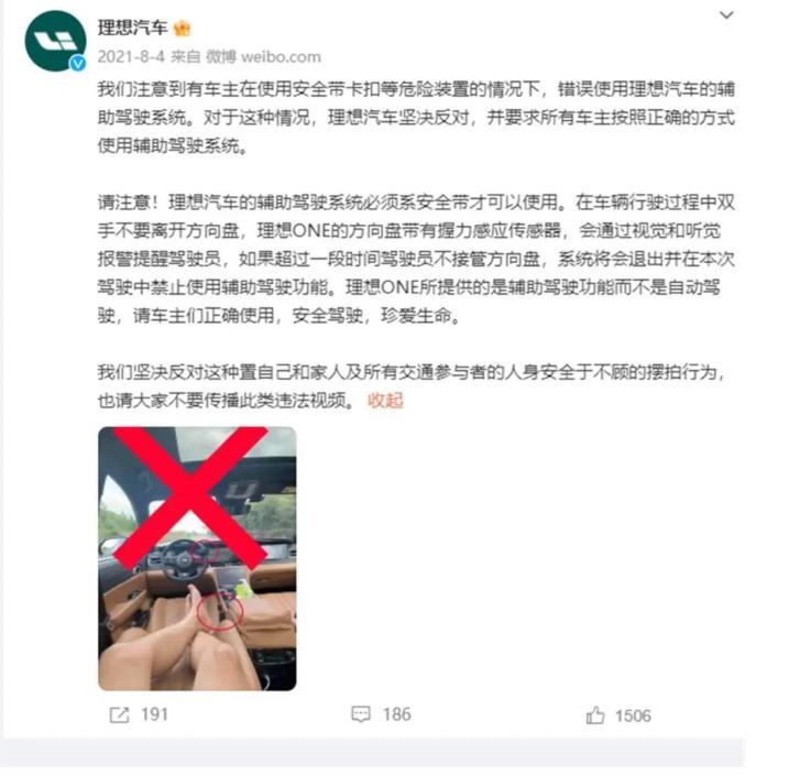 不過,這并非是理想汽車首次因類似危險操作受到關注。早在2021年,一段視頻引發了網友的熱議,視頻中一輛理想ONE的車內,主駕和副駕座椅都被放倒,車主和乘員直接平躺在車內,并發出來炫耀。對此,理想汽車在官方微博回應稱:“我們注意到有車主在使用安全帶卡扣等危險裝置的情況下,錯誤使用理想汽車的輔助駕駛系統。對于這種情況,理想汽車堅決反對,并要求所有車主按照正確的方式使用輔助駕駛系統。”