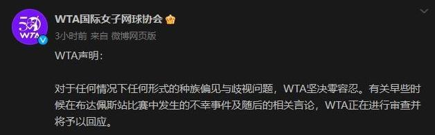 對此,WTA官方發出了明確的聲明:“WTA堅決零容忍任何形式的種族偏見與歧視問題。有關早些時候在布達佩斯站比賽中發生的不幸事件及隨后的相關言論,WTA正在進行審查并將做出回應。”WTA官方對事件的態度表明了對種族偏見和歧視問題的堅決反對,并承諾會對事件進行公正的審查。