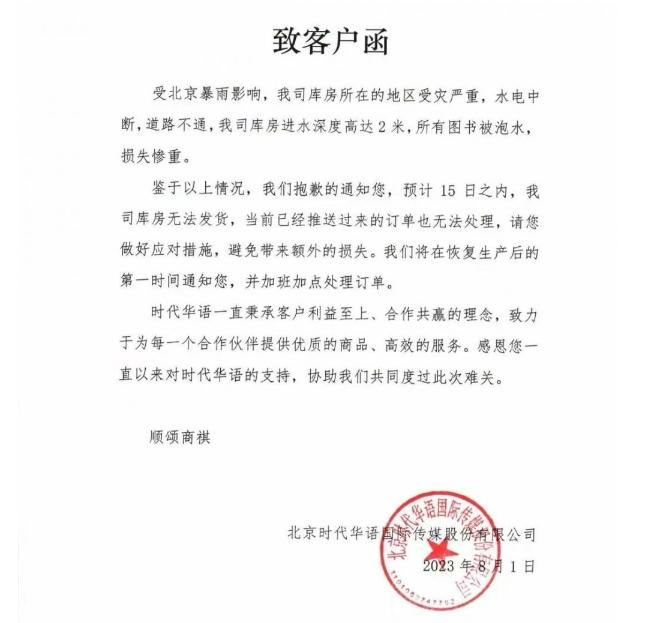 由于災情,中圖網官方微博于8月1日發布通知,涿州地區停止快遞發貨,訂單延期處理,恢復時間將另行通告。