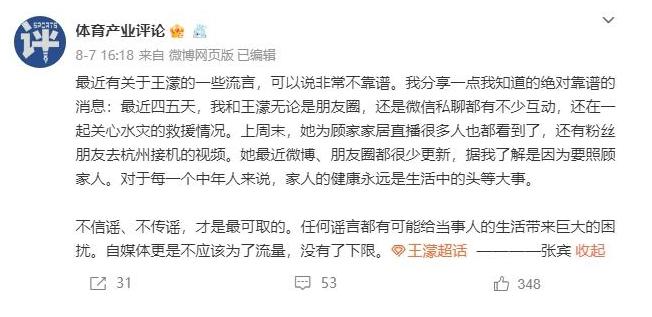 然而,體育記者張賓于8月7日發聲辟謠:“最近有關于王濛的一些流言,可以說非常不靠譜。”