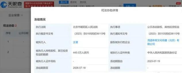 8月9日,據中新經緯消息,天眼查app顯示,近日,前短道速滑國家隊選手王濛新增一則股權凍結信息,股權被執行企業為灣道體育文化傳播(北京)有限公司,被凍結股權數額445萬人民幣,凍結期限自2023年7月19日至2026年7月18日。