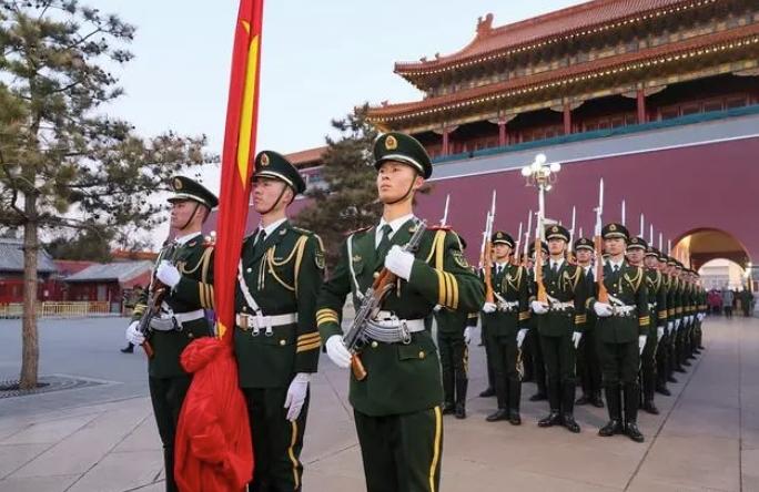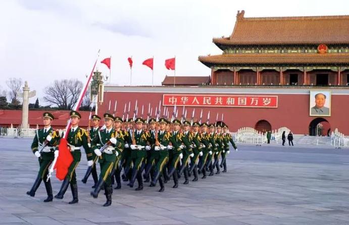 天安門廣場就會出現一支由解放軍官兵組成的國旗護衛隊。他們身著整齊的軍裝,手持莊嚴的國旗。他們步伐一致、動作規范、表情嚴肅、氣勢雄壯。他們從天安門城樓出發,在金水橋和長安街上行進,在廣場中心停下,并在國歌聲中將國旗緩緩升起。
