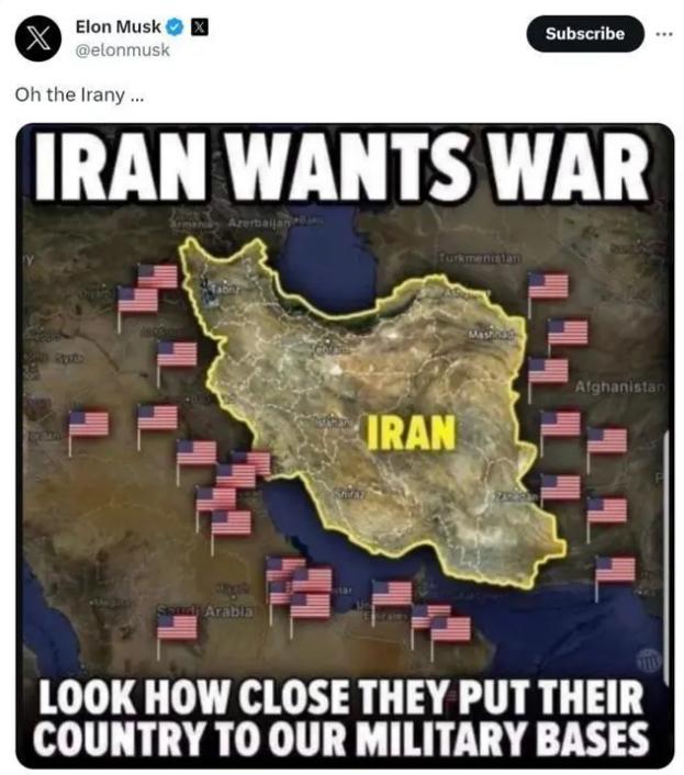 馬斯克的帖子中,他分享了一個圖示,標明了美軍在中東地區的軍事基地分布情況。圖中,美軍基地星羅棋布,而伊朗的國土幾乎被這些基地所包圍。一句讓人深思的評論:“伊朗這是想打仗,你看他們把國家放得離美軍基地多近啊!”讓人們不禁思考伊朗與美國之間的緊張關系以及全球軍事力量的部署。