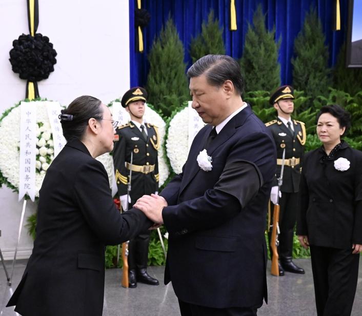 習近平和夫人彭麗媛,以及其他黨和國家領導人在哀樂聲中緩步來到李克強同志的遺體前,肅立默哀并向遺體三鞠躬,隨后與李克強同志的親屬一一握手,表達深切的慰問。胡錦濤也送上花圈,對李克強同志的逝世表示哀悼。