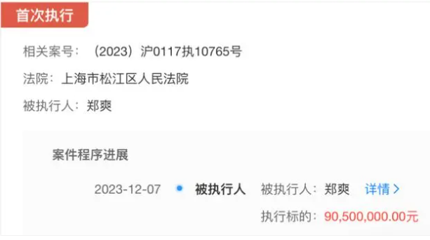近日,海寧東開之星影視投資有限公司與鄭爽服務合同糾紛案件的執行情況有了新的進展。據上海市松江區人民法院披露信息,法院對鄭爽實施強制執行,要求她支付總額達9050萬元的款項。