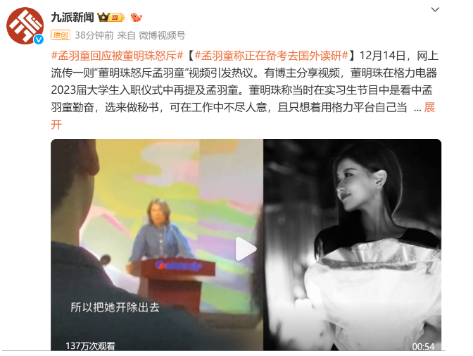 2023年12月14日,一段視頻在網(wǎng)絡上迅速傳播,視頻內容為董明珠在格力電器2023屆大學生入職儀式上再次提及新任秘書孟羽童的言論,引發(fā)了廣泛的討論和熱議。