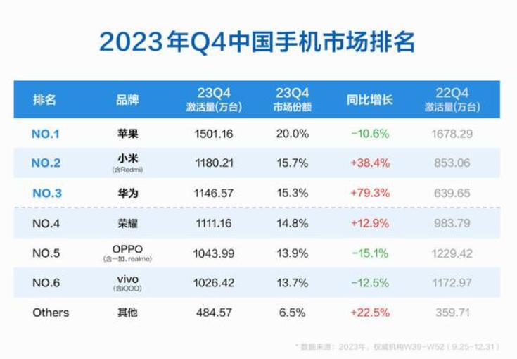 首當其沖的是蘋果,以1501.16萬臺激活量位居第一,然而,整個季度激活量同比下滑10.6%。小米則以驚人的38%銷量增長登頂國產第一,總排名緊隨其后。華為以15.4%的份額成功升至第三,而榮耀、OPPO、vivo分列其后,銷量略有下滑,跌幅均超過10%。
