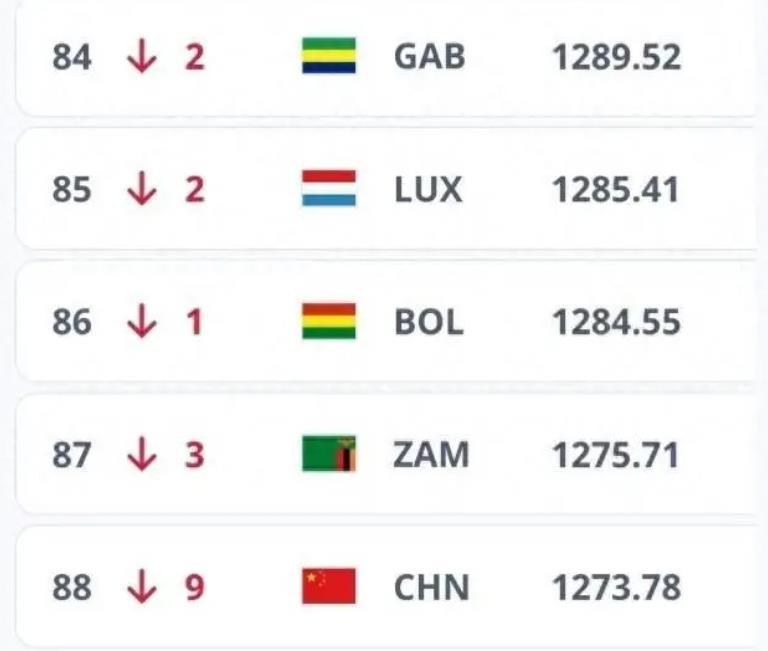 中國(guó)國(guó)家男足的排名在國(guó)際足聯(lián)最新發(fā)布的世界排名中下降了9位,跌至第88名。這一下滑主要是由于近期在亞洲杯上的糟糕表現(xiàn)所導(dǎo)致的。