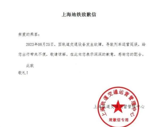 上海地鐵公司在8月25日發布了一封致歉信,對于因軌道交通設備故障而導致列車運營延誤表示歉意,并感謝乘客的理解與支持。
