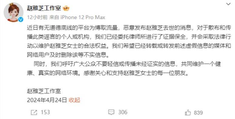 近日,關于著名演員趙雅芝去世的謠言在網絡上流傳甚廣,引起了廣大網友的關注和擔憂。針對此事,趙雅芝女士的工作室于4月24日晚發表聲明,嚴正辟謠,并對散布謠言者表示強烈譴責。