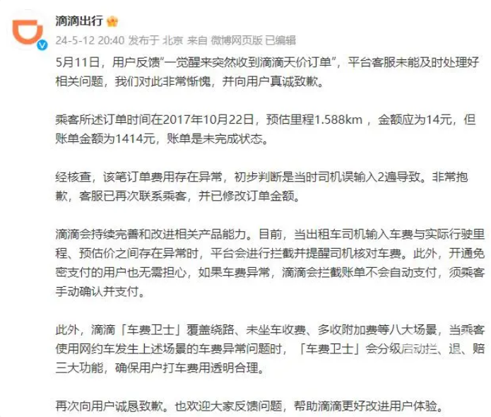 隨著移動互聯(lián)網(wǎng)的發(fā)展,打車軟件成為人們生活中不可或缺的一部分。然而,近日上海一名網(wǎng)友的經(jīng)歷卻引發(fā)了廣泛關(guān)注,她在滴滴出行小程序中發(fā)現(xiàn)一筆異常訂單:2017年的一張出租車行程單,金額高達1414元,而實際行程僅2公里,行駛時間僅7分鐘。