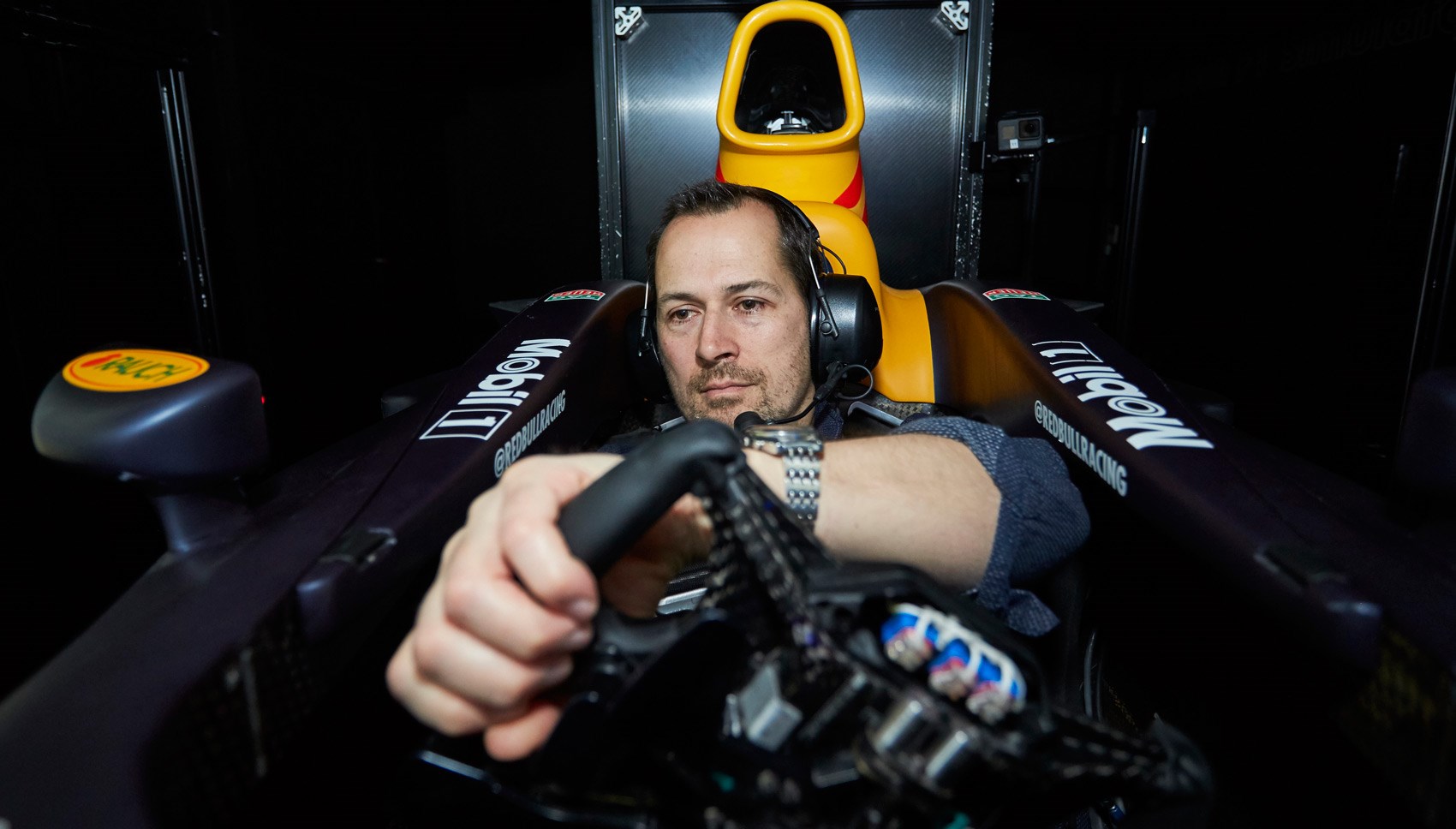 因為我們使用的模擬器以前是由F1車隊使用的,所以液壓油缸頂部的駕駛艙不是虛擬的Valkyrie駕駛艙,而是真正的前F1紅牛F1賽車。一旦你在那里,這是一個緊張的擠壓通過開口和相當幽閉恐懼癥。前面有一個大的弧形屏幕,顯示由三臺投影機創建的環繞圖像。
