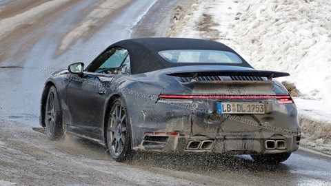 我們以多種形式推出了新款992,但保時捷仍在為一些更加美觀的車型(如911 Turbo和GT3)進行最后潤色。在我們等待的時候,我們的間諜攝影師設法拍攝了911 Turbo Cabriolet冬季測試。除了rag-top - 這顯然標志著它作為Cabriolet - 顯示的測試車輛具有四管排氣配置。沿著汽車的側面,切入后部輪輞的通風口標志著強制感應渦輪增壓。(或者渦輪增壓渦輪增壓器,正如我們有時在辦公室稱之為 - 所有911現在都被強制感應)。