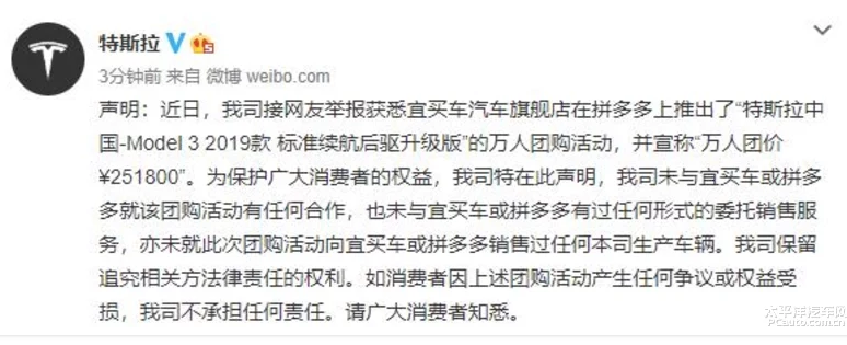 特斯拉官方聲明稱:近日,我司接網友舉報獲悉宜買車汽車旗艦店在拼多多上推出了“特斯拉中國-Model 3 2019款 標準續航后驅升級版”的萬人團購活動,并宣稱“萬人團價¥251800”。為保護廣大消費者的權益,我司特在此聲明,我司未與宜買車或拼多多就該團購活動有任何合作,也未與宜買車或拼多多有過任何形式的委托銷售服務,亦未就此次團購活動向宜買車或拼多多銷售過任何本司生產車輛。我司保留追究相關方法律責任的權利。如消費者因上述團購活動產生任何爭議或權益受損,我司不承擔任何責任。請廣大消費者知悉。