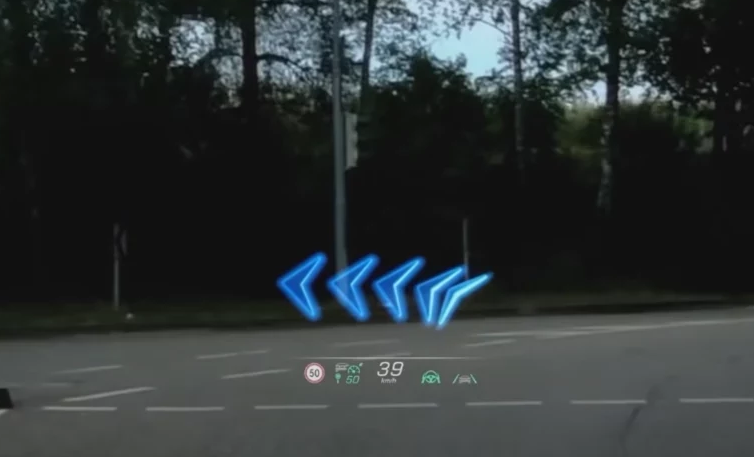 例如:在車輛開始偏離車道時,該系統會顯示紅色動畫警告線,并指引正確的行駛方向;而在彎道時,該系統會顯示動態箭頭,并隨著距離的減少,而發生變化。