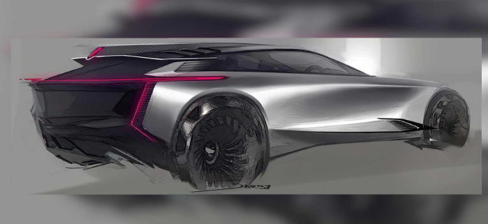 相比之下,草圖的其余設計被壓制了,僅顯示了分頻器的后四分之三視圖。側面沿底部有一條微妙的設計線,從前輪后面開始作為通風口。但是,這是典型的凱迪拉克風格,其肩線結實,通常從大燈向下延伸至車輛側面。草圖具有通常的造型喇叭,例如超大的輪子和超短的懸垂。