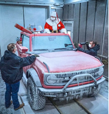 現在,福特發布了兩張原始圖片,并在那一刻進行了精彩的娛樂,現在圣誕老人身處全新2021 Bronco的背后。就像50年前的圖像一樣,新照片顯示了福特冷室實驗室中的圣誕老人和新野馬,它們位于零下30度的寒冷區域。確切的規格是帶有Sasquatch套件,刷子桿和模塊化前保險杠的兩門外排車型。自然,外表穿著喜慶的Race Red透明外套,與原始樣式相似。