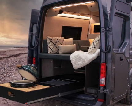 您需要所有座位,因為Loef的露營者配備了一流的炊具。該廂式貨車具有完整的室內范圍,并帶有四個燃燒器的爐灶和烤箱。但這還不是全部,因為Loef還為其提供了可滑動的Big Green Egg Mini Max陶瓷烤架,該烤架隱藏在后休息室/沙發區的下方。它帶有一個支撐架,因此用戶可以將其放置在營地周圍的其他地方。露營者通過內置的迷你吧來補充烹飪技巧,該迷你吧可以容納兩瓶酒,四個玻璃杯,一個開瓶器和一個服務員的開瓶器。服務員不包括在內。