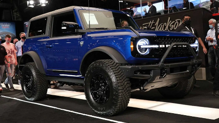 有問題的兩門硬頂Bronco VIN 001是滿載的第一版車型,采用獨家的Lightning Blue外墻涂料。內部,海軍碼頭的皮革裝飾座椅充斥著機艙,引擎蓋上裝有一個2.7升V6 EcoBoost發動機,該發動機與10速自動變速器相連。