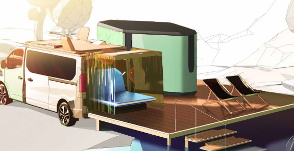 由于這只是一個預(yù)告片,雷諾并沒有對其 Hippie Caviar Hotel 的想法提供清晰的外觀,但我們被告知它是基于豪華的五星級酒店的公路體驗。因此,期待里面有時髦的材料和異國情調(diào)的木材,混合著柔和的色彩。雷諾說日本紙效果“和紙”涂料是配方的一部分,是的,確實有一個屋頂露臺。它由一張帶可拆卸靠背的咖啡桌組成,可通過梯子進入。