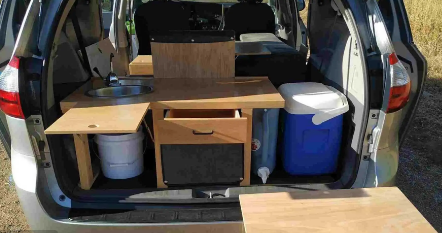 后排已經(jīng)拆除了第三排座椅,為 Oasis Campers 提供了安裝廚房的空間,包括冰箱。一個(gè)手泵水槽,連接到兩加侖的淡水,排入一個(gè)灰水桶。有一個(gè)五加侖的水壺可以喝水。Sienna 在廚房下方還有一個(gè)儲(chǔ)物格,用于存放不太常用的物品。駕駛室主區(qū)域內(nèi)有一個(gè)小座椅和長(zhǎng)凳,可轉(zhuǎn)換為床,尺寸為 4 英尺 x 6 英尺。