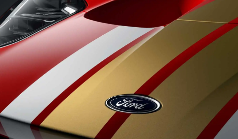 之前的福特 GT 傳承版向 1964 年的福特 GT 原型致敬。它采用溫布爾登白色車身,前分離器、側門檻、后視鏡桿、發動機百葉窗和后擴散器上均采用外露碳纖維。車頂和后甲板上的條紋是反物質藍,同樣的顏色覆蓋了涂漆的碳纖維 20 英寸車輪。制動卡鉗為銀色,帶有黑色圖形