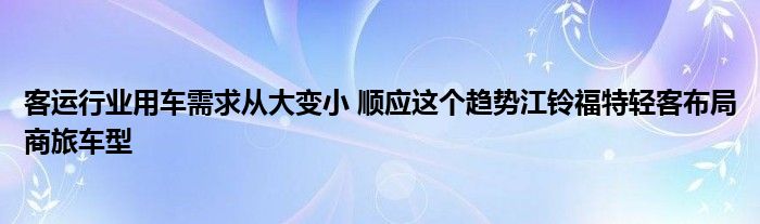 在政策的鼓勵下,客運行業用車需求“從大變小”。順應這個趨勢,江鈴福特輕客布局商旅車型,連續推出新世代全順客運車型、福特新全順商旅型、江鈴特順客運車型這“三劍客”,化身為客運行業發展中的“后浪”,用自身優秀的產品,來回報1000萬用戶和客運行業對他們的期許。