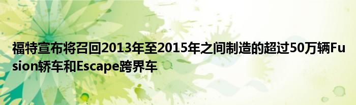 福特周三宣布,將召回2013年至2015年之間制造的超過50萬輛Fusion轎車和Escape跨界車,原因是變速線故障可能無法停放汽車。此次召回包括2013-16福特Fusions和2013-14福特Escapes。