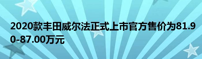 4月30日消息,我們從官方獲悉,2020款豐田威爾法正式上市,新車主針對配置進行了提升,官方售價為81.90-87.00萬元,相比現款車型有小幅提升。