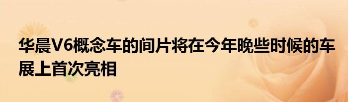 來(lái)自華晨V6概念車的間片將在今年晚些時(shí)候的車展上首次亮相。V6是一款中型跨界車,將于2013年底在汽車市場(chǎng)上發(fā)布。從尺寸上看,它與新的華晨H230相當(dāng)。這將使V6長(zhǎng)約4.5米。