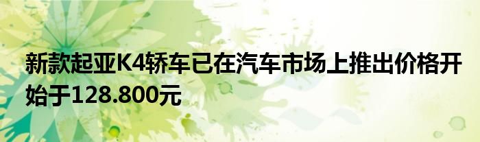新款起亞K4轎車已在汽車市場上推出。價格開始于128.800元,結束于189.800元。該起亞 K4是一個新,只有緊湊型轎車,它首次亮相上個月在成都車展。
