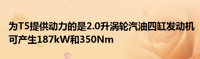 為T5提供動力的是2.0升渦輪汽油四缸發動機,可產生187kW和350Nm。通過八速自動變速箱后,通過全輪驅動系統發送。所有T5車型都配備動態底盤調,而R-Design增加了換擋撥片,四輪機箱和Polester優化調,可將發動機輸出功率提升至192kW和400Nm。
