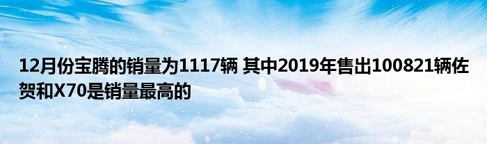 寶騰已公布2019年12月的銷售業績數字,報告稱上月銷售11117套,較11月管理的9643套大幅躍升。這些數字使12月成為該品牌2019年表現最好的月份,也是該公司自2014年7月以來首次在一個月內銷售超過11000輛汽車。