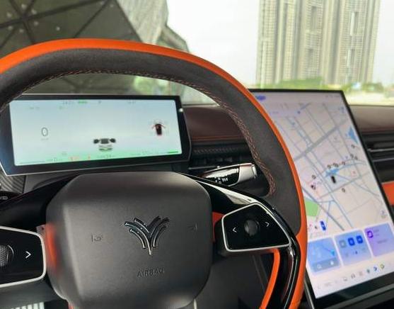 進(jìn)入車內(nèi)后,哪吒GT的設(shè)計(jì)會(huì)讓人眼前一亮。與許多跑車“毛胚房”一般的內(nèi)飾不同,哪吒GT的內(nèi)飾異常豪華。進(jìn)到車內(nèi)很難不注意到那超大的屏幕,車內(nèi)大量采用翻毛皮和真皮包裹,質(zhì)感極佳。雖然它在方向盤上布置了兩個(gè)實(shí)體按鍵,但基本上都被屏幕所取代。