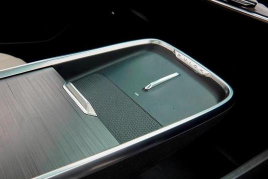 中央扶手臺(tái)處有兩塊無線充電面板,上層則有可伸縮的實(shí)木蓋板來保護(hù)該面板。