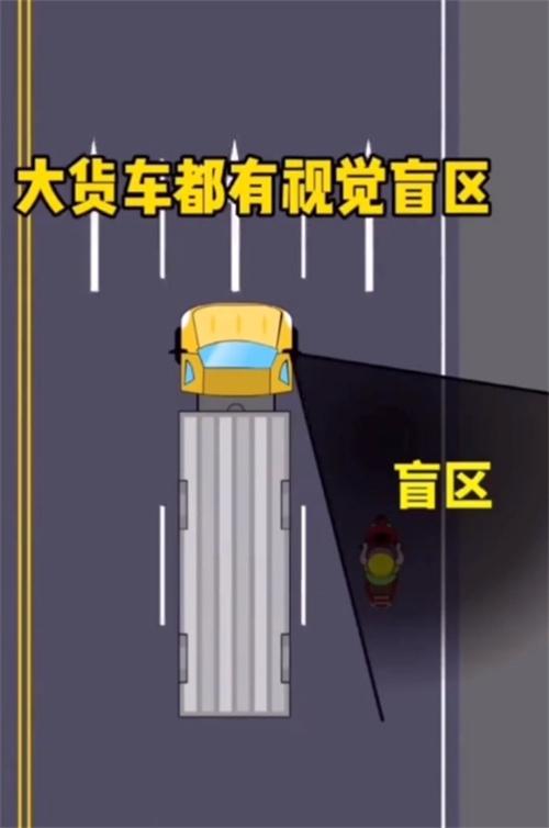 大貨車正后方是全盲區。當有行人、非機動車以及機動車出現在后面時是完全看不到的。因此,非貨車駕駛人跟車行駛時應保持3米以上的安全車距,并在超車前確認后方無大貨車。