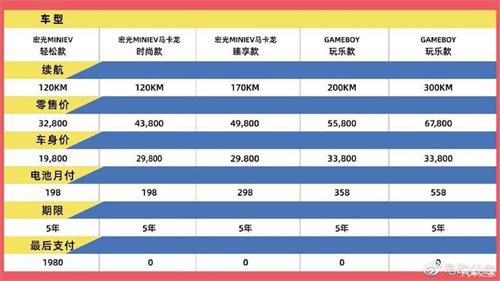 五菱宏光MINIEV推出"輕松來電"購車服務,首付1.98萬元起,按照5年60個月的方式支付電池價款,每月最低198元。該方案適用于宏光MINIEV的多個車型,包括輕松款、馬卡龍時尚款、臻享款和GAMEBOY玩樂款,覆蓋不同續航版本,分別為120km、170km、200km和300km。
