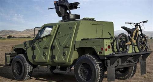 車頂正上方可以看到圓形的天窗,設計感有點像坦克的觀察窗,打開后可以安裝液壓機槍支架。而后面的貨斗裝備了一些必要的脫困工具,并且還能夠裝載不少輕武器。車輛尾部可以安裝越野摩托車進行偵查任務。總體來看,這款全新的軍用越野車功能齊全,外觀更加封閉,安全系數應該比以前的悍馬車更高一些。