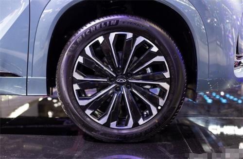 瑞虎9最低配車型采用19寸輪轂,其余均為20寸,但輪胎寬度均為245,無論是性能還是視覺效果都非常出色。另外,密輻式+渦輪造型的雙色輪轂看起來既高級又運動,搭配米其林的輪胎,車輪這塊很難讓人挑出刺來。