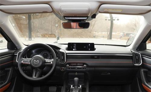 打開車門,中控臺延續(xù)了馬自達(dá)獨特的風(fēng)格,偏向主駕駛的設(shè)計。做工和用料達(dá)到了豪華車的水準(zhǔn),并加入了少量縫線,看上去既粗獷又時尚。10.25英寸的中控屏內(nèi)置馬自達(dá)第三代悅聯(lián)系統(tǒng),支持實體按鍵和語音控制,還具備GPS導(dǎo)航、車聯(lián)網(wǎng)和OTA升級等功能。半懸浮式設(shè)計考慮到了駕駛員的視野通透性,這也符合馬自達(dá)“駕駛者之車”的初衷。