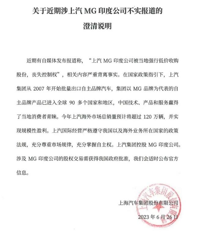 近日,上汽集團(tuán)就有關(guān)“上汽MG(名爵)印度公司被當(dāng)?shù)貜娦械蛢r收購股份,喪失控制權(quán)”一事發(fā)布了澄清說明。該報道被指責(zé)嚴(yán)重背離了事實,上汽集團(tuán)對此進(jìn)行了回應(yīng)。